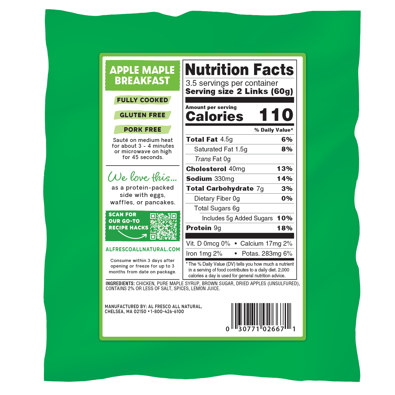 CHICKEN, PURE MAPLE SYRUP, BROWN SUGAR, DRIED APPLES (UNSULFURED), CONTAINS 2% OR LESS OF SALT, SPICES, LEMON JUICE.